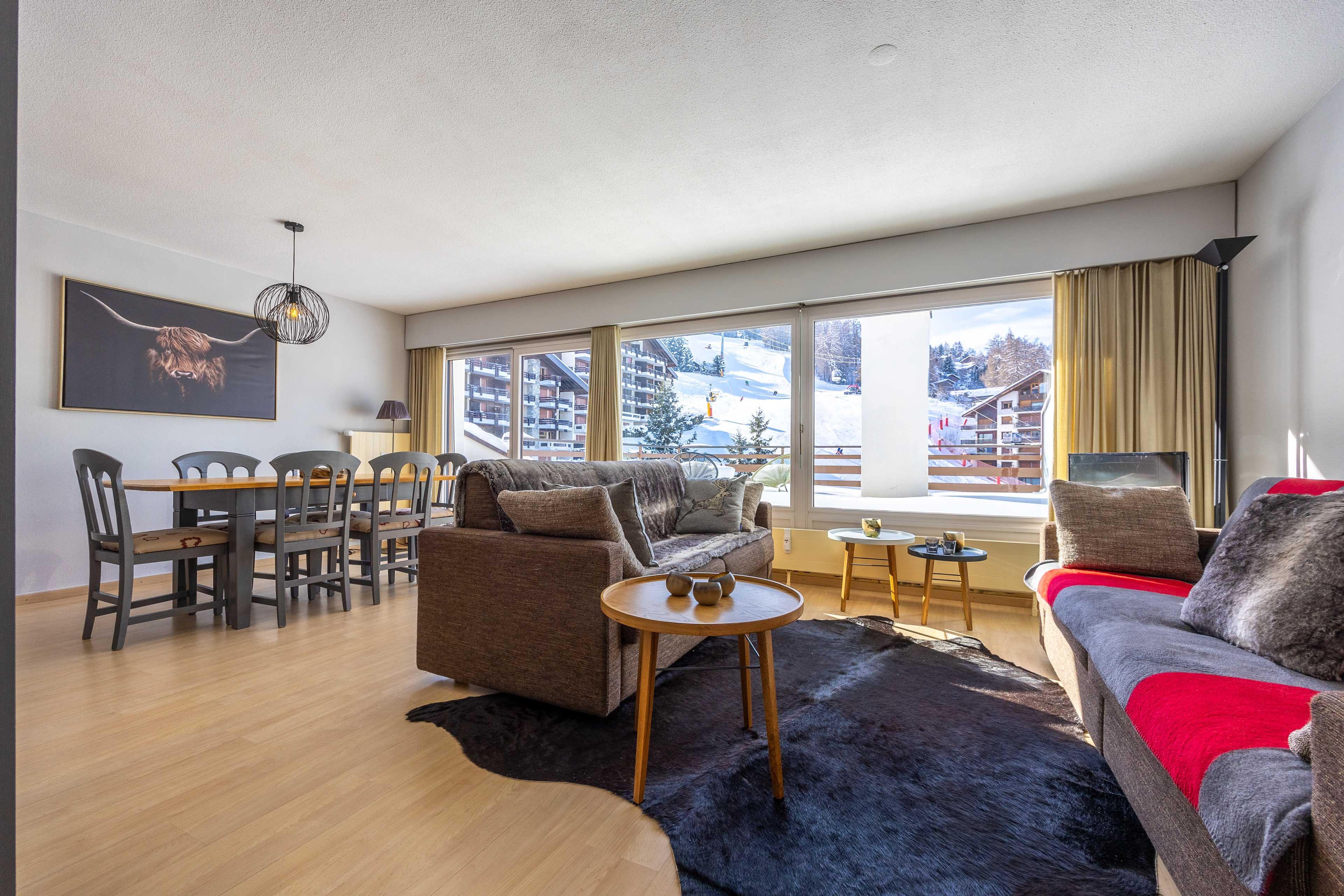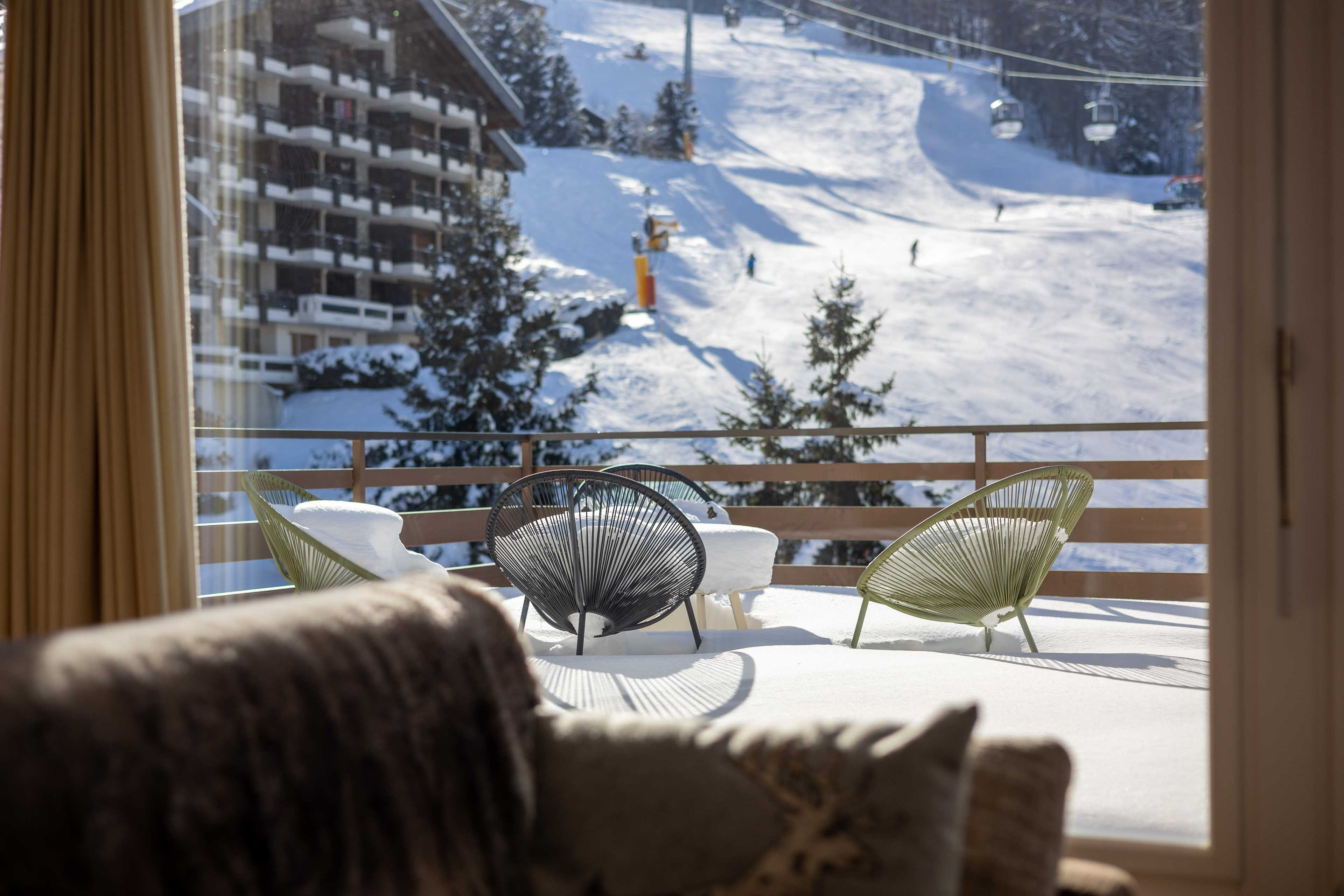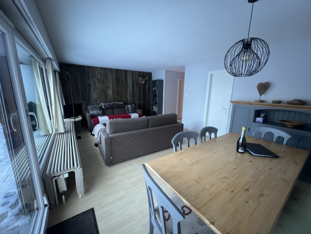 * Living room, dining room with large sunny terrace, view of the Tracquet ski slope.