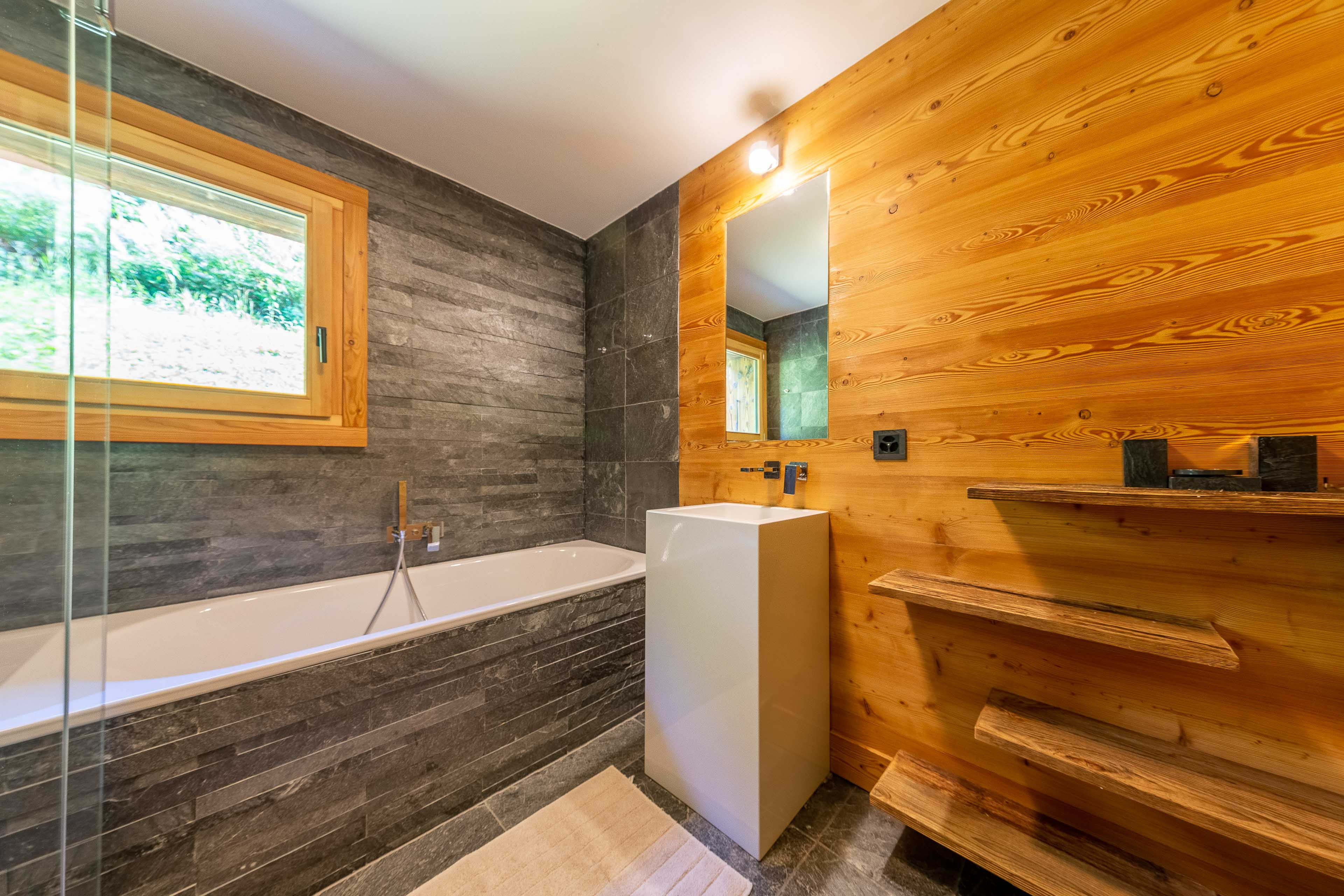 * Chambre 3 : lit double et SDB en suite avec baignoire, douche, wc et double lavabo - accès sur une terrasse